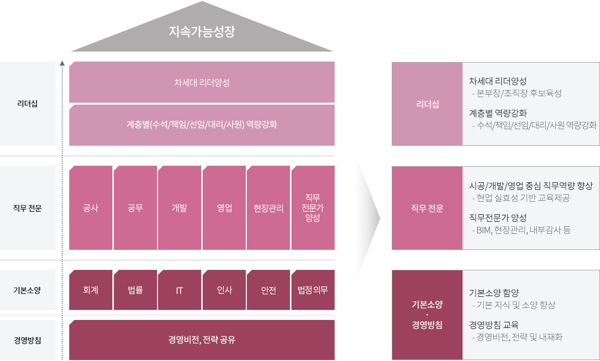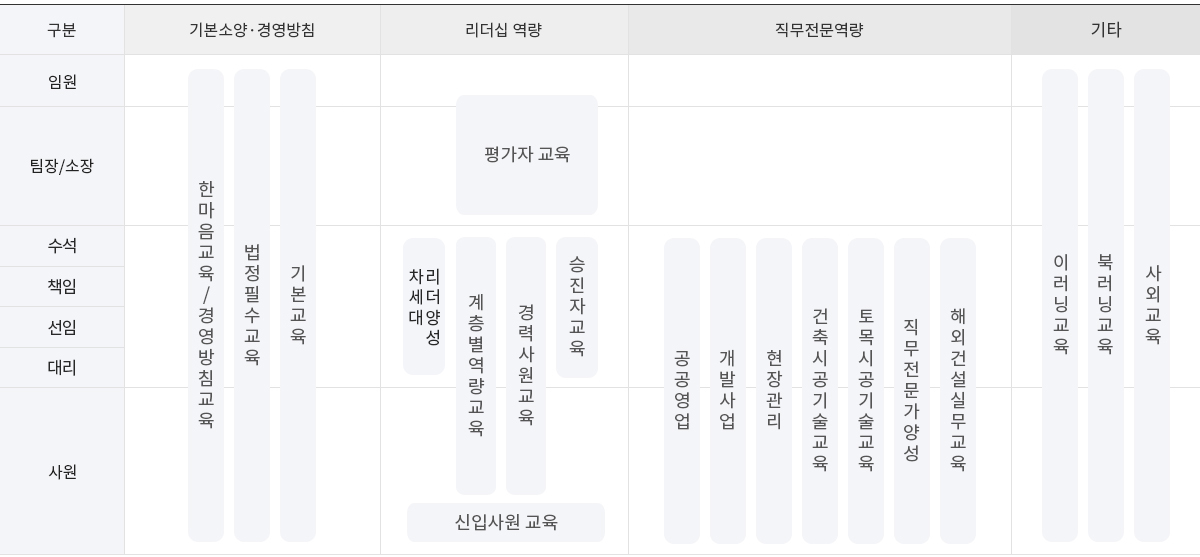 조직 및 개인의 지속가능성장을 위해 '리더십, 직무전문, 기본소양, 경영방침'을 토대로 교육체계를 수립하여, 임직원 역량향상을 위한 교육을 지원하고 있습니다.